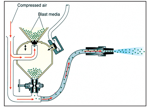 در این نوع سیستم، کمپرسور جریان هوای فشرده شده را وارد نازل سند بلاست میکند و از طریق نازل در مخزن کابین مکش ایجاد میشود و پودری که وارد نازل شده به همراه جریان هوا به سطح مورد نظر برخورد میکند. این سیستم بعد از مخزن پودر، یک شیر باد کوچک دارد که مانع گیر کردن پودر در مسیرمی شود. این شیرها معمولا به صورت نیمه باز هستند. در ضمن به دلیل سایندگی بالا باید شلنگ خروجی مخزن پودر را از جنس شلنگهای چند جداره انتخاب کنید تا پودر باعث ساییدگی نشود.