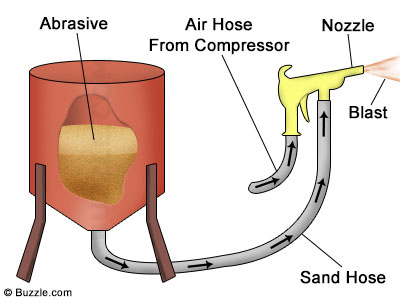 مکانیسم کار سندبلاست قابل حمل بدین صورت است که کمپرسور هوا باعث بسته شدن درپوش لاستیکی دیگ ورودی پودر مخزن شده و پودر (شن، گریت) با فشار بالا وارد شلنگ سندبلاست میشود و از طریق شلنگ به نازل رسیده و با فشار به سطح مورد نظر برخورد میکند و از این طریق هرگونه آلودگی یا پوشش روی سطح کار را از بین می برد.